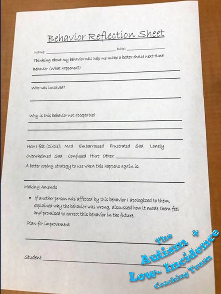 Some students are able to process behavior by reflecting at a later time with staff. This allows them to think ahead and develop a plan for what to do the next time they are in a similar situation. It is important to use this as a priming tool and not a time to scold or lecture which is likely to result in escalating behaviors.